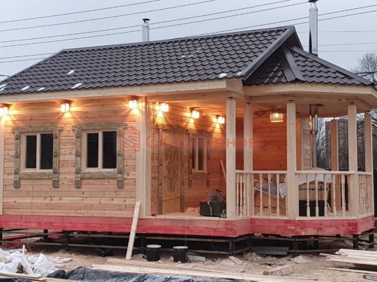 Для строительства деревянной бани 6х8 метров СК Смирнов разработал проект №216 с обустроенной парной и комнатой отдыха. По планировке общая площадь составляет 42 квадратных метров. Можно выделить несколько особенностей проекта: терраса, веранда, туалет и купель. Мы строим бани под ключ с полной отделкой снаружи и внутри.