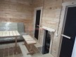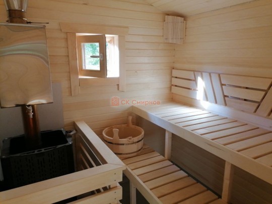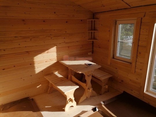 В комплект бани входит стол и две скамейки из доски 19мм, как на фото. Есть комплекты из более толстой доски а также из кедра, смотрите в доп комплектации.
