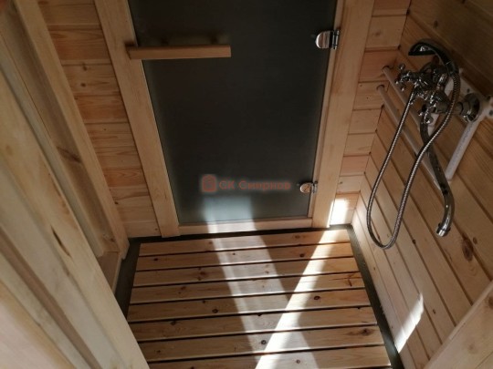В комнате для приема душевых процедур на полу устанавливается душевой пластиковый поддон который имеет слив на улицу. В поддоне лежит деревянный трапик для удобства.
