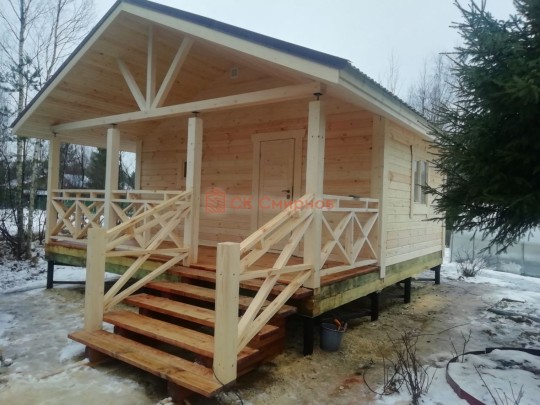 Сам проект стал топовым в 2020 году. Выносная терраса 12 кв.м. под общей двускатной крышей выглядит очень уютно — перекрёстные балки сверху не только распределяют нагрузку на крышу, но и великолепно вписываются в общий дизайн бани. Крышу поддерживают мощные брусовые столбы с домкратиками для регулировки уровня. Если сруб даст усадку, то можно просто выставить нужный уровень — и никаких перекосов.
