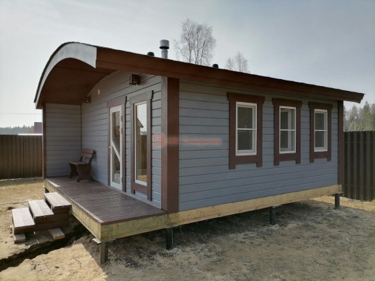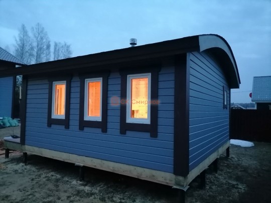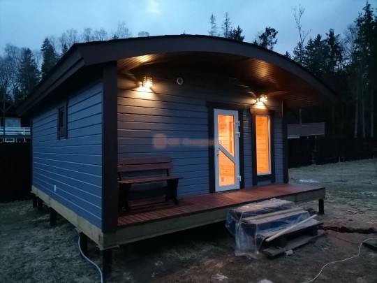 Размер 5,3 на 6 метров. Внутри 4 помещения: комната отдыха, парная, душ и санузел, где размещается душевая система. Ориентировочный срок строительства 10 дней.