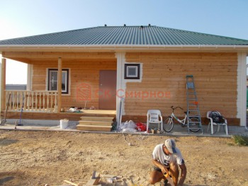 Из профилированного сухого бруса 9х14см, 14х14 см или 14х19 см. Сборка сруба в теплый угол на нагеля или гвозди 200 мм со сверлением отверстия в верхнем брусе (в зависимости от вида бруса).