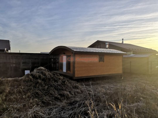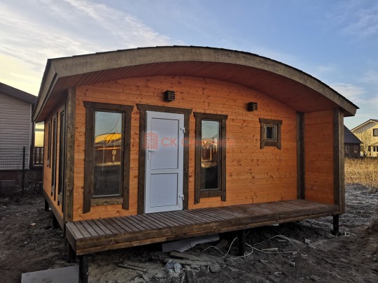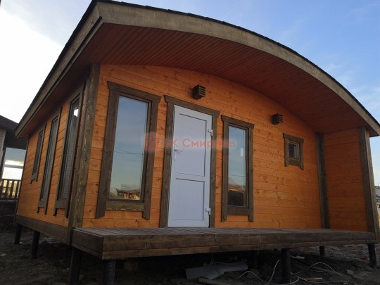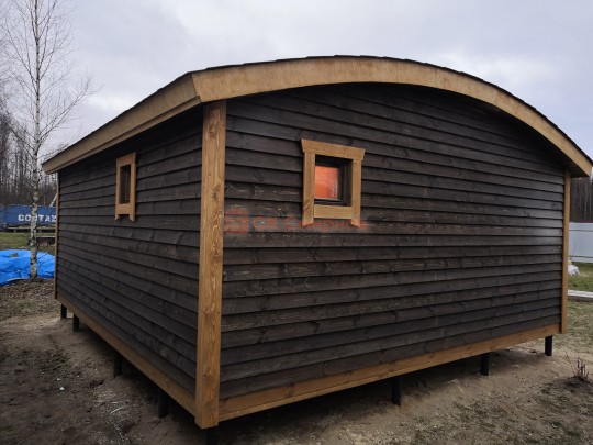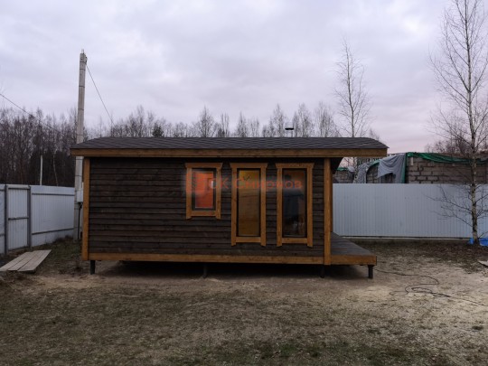Бани подобного типа мы строим как по каркасной технологии с утеплением и обшивкой доской внахлёст, так и из клееного или сухого бруса. В обоих случаях качество сборки превосходное: баня тёплая, надёжная и очень красивая.