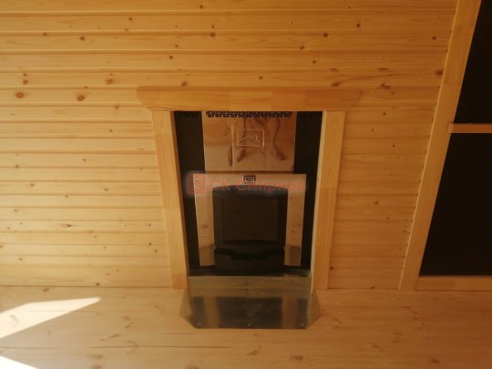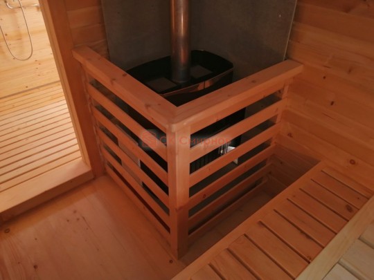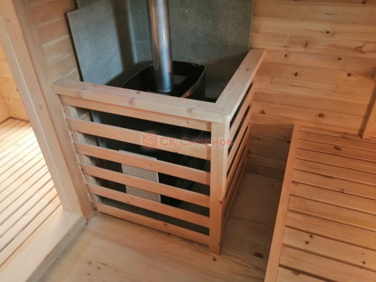 Установка печи Теплодар Русь сетка 12 л панорама ( со стеклянной дверцей ), трубы сэндвич, проходы и зонт входят в стоимость бани. Экран металлический через стену. На полу кладется кирпич, базальтовый картон, минерит. На стенах базальтовый картон, минерит, через втулки прикручивается минерит. Ссылка на сайт производителя https://www.teplodar.ru/catalog/detail/rus_setka_12_l_panorama/